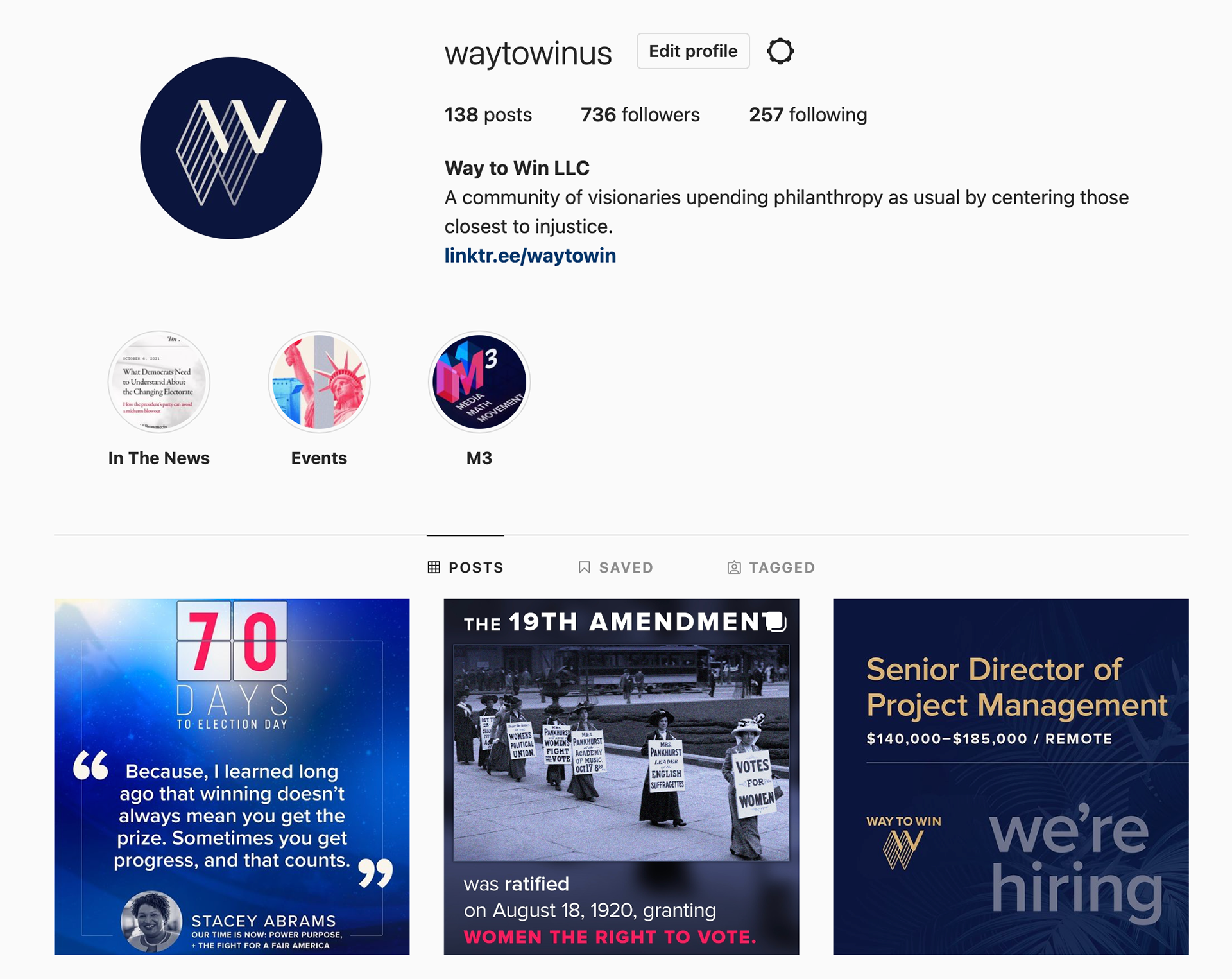 Manages all social media accounts (Facebook, Twitter and Instagram) for Way to Win and their additional brands.