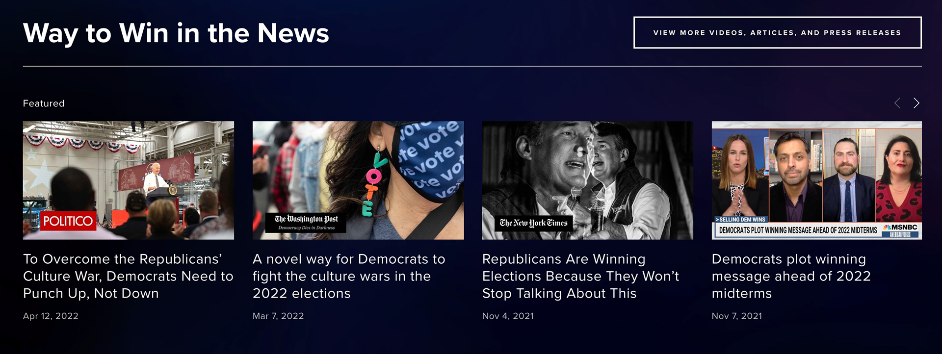 Develops and drives public relations program to build Way to Win’s national brand. Helped place stories in The New York Times, The Washington Post, The Atlantic and MSNBC. Responsible for national media rollouts.